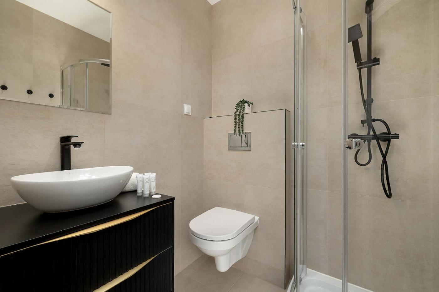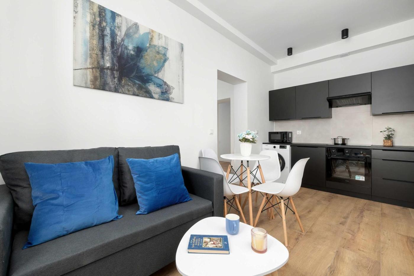 Apartament z 1 sypialnią. Boasting a private entrance, this apartment features 1 living room, 1 separate bedroom and 1 bathroom with a shower and a hairdryer. Meals can be prepared in the well-fitted kitchenette, which has a stovetop, a refrigerator, a dishwasher and kitchenware. The apartment has parquet floors, a seating area with a flat-screen TV with streaming services, a washing machine, a tea and coffee maker, as well as a dining area. The unit has 2 beds. Apartament - 5 osobowy. Powierzchnia pokoju ok.: 25 mkw.